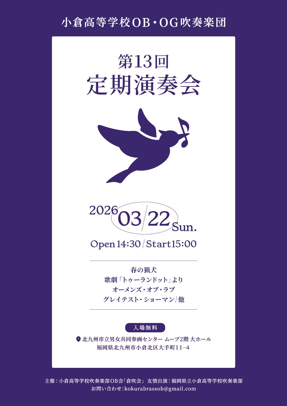 小倉高等学校吹奏楽部 および OB吹奏楽団の定期演奏会のお知らせです。